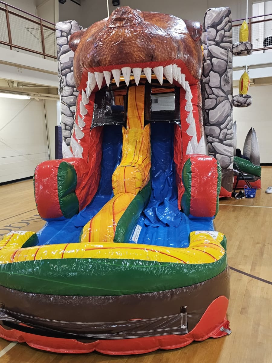 Bounce house rentals T-Rex® Combo Double Lane Inflated Pool Wet in All of Louisville and surrounding areas, southern Indiana and surrounding areas 🦖💦. Expertly designed for maximum fun, this all-in-one inflatable features a bounce house, double-lane slide, and an inflated splash pool. Durable vinyl construction and vivid T-Rex graphics deliver excitement and safety for kids at birthday parties, charity events, and back yard get togethers. 🎉