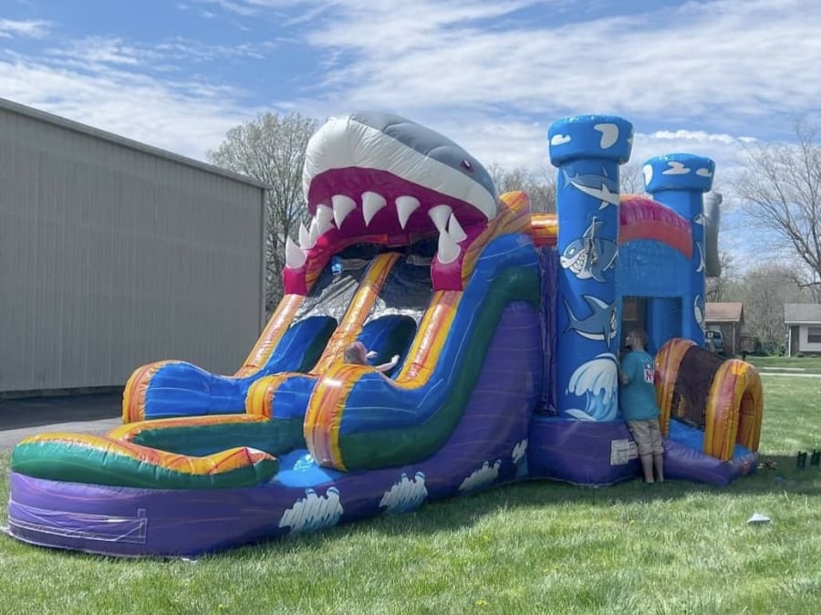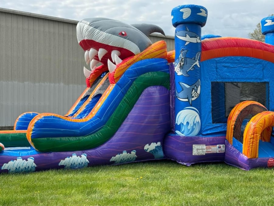 Expertly built for maximum fun and safety, the Shark Multi Color Combo Double Lane Inflated Pool combines a bounce house, double-lane slide and an inflated pool into one all-in-one unit. Perfect for birthday parties, end of school events, family get-togethers and charity events. Durable vinyl. Fast setup. Endless smiles. 🎉